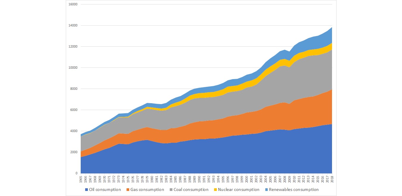 Figure 1: Global energy consumption by fuel type, 195-2018 (million tonnes of oil equivalent)