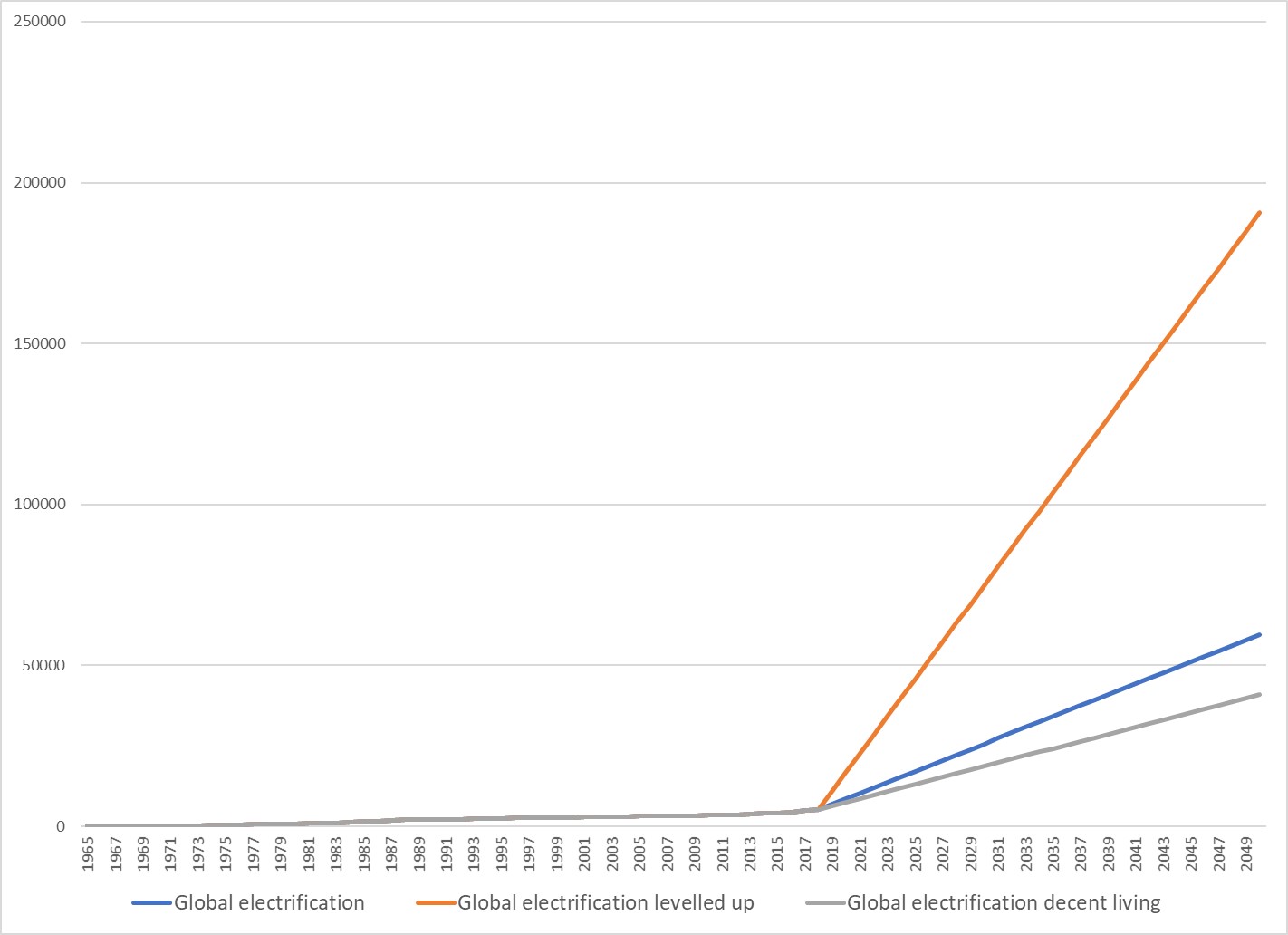 The blue line indicates the necessary increase if existing global final energy use turned exclusively to low carbon electricity, based on Dr Biegler’s conservative factor of 2.4, while ignoring the factors pushing energy use higher that I just mentioned – therefore underestimating the true challenge. But this leaves untouched the differences in energy use between richer and poorer countries, making this scenario implausible. Poorer countries are unlikely to invest massively in a low carbon energy transition without remedy to the gulf between rich and poor country levels of energy use – especially the energy-hungry poorer countries that are now the world’s industrial powerhouses, and that currently are heavily dependent upon fossil fuels.